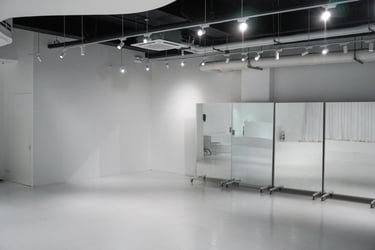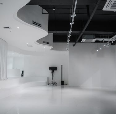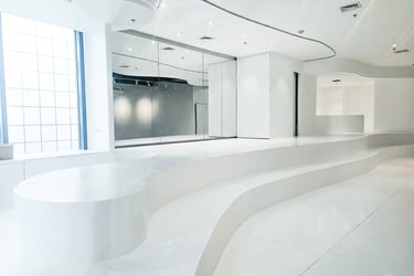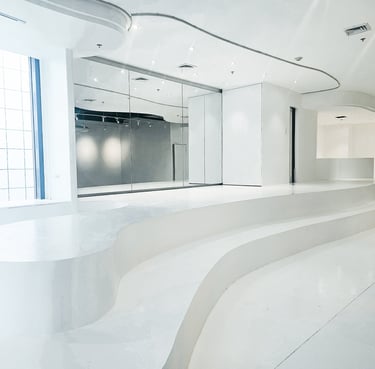 A dance studio designed to let the movement take center stage. With a monochromatic palette of all-white finishes, curved bleachers, and dramatic black ceilings, the space exudes flow and elegance. The design keeps the focus on the dancers, ensuring a fluid, inspiring environment while remaining true to the Blockhaus philosophy of simplicity, elegance, and functionality.